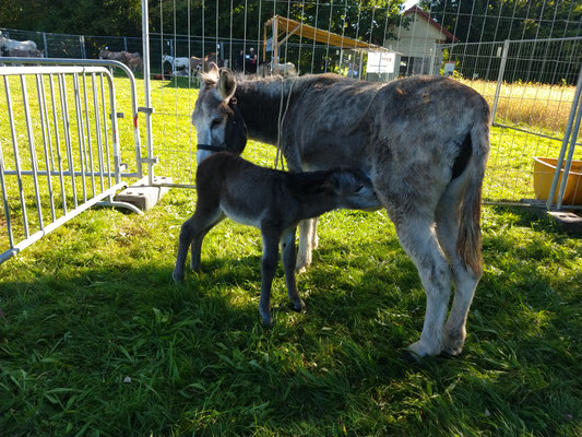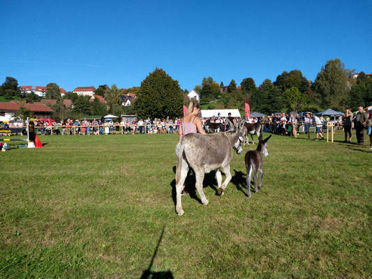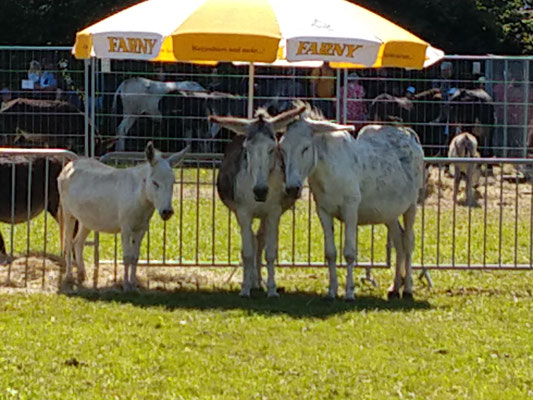 Bei herrlichem Wetter wurden tausenden Besuchern die Welt der Esel näher gebracht und erklärt. Mittlereweile sind unsere Enkel in dem Alter, dass sie alleine die Esel durch den Ring führen (stolze Oma :-). Bei der Fohlenschau wurde dann der 1. Platz mit "Pirelli" belegt. Und selbst unsere erwachsenen Kinder haben uns besucht und mitgeholfen, dass mich ganz besonders gefreut hat! Vielleicht springt das "Eselfieber" doch noch über.. ;-)